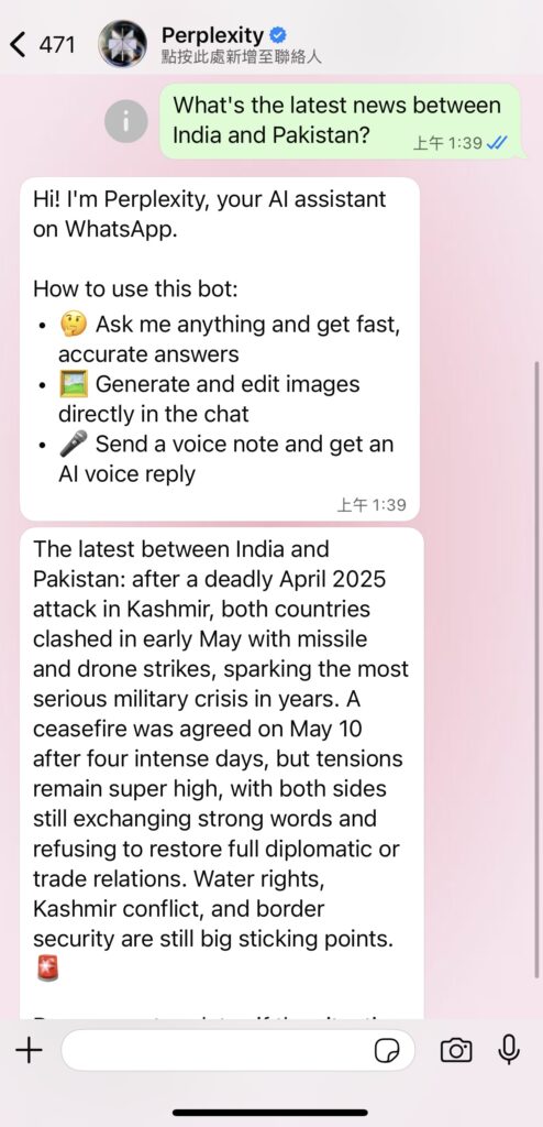 - WhatsApp 會自動開啟新聊天視窗,顯示 Perplexity 官方帳號。