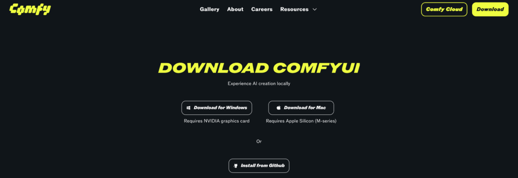 前往 ComfyUI 官網,選擇對應的操作系統(如 Windows),像安裝普通軟體一樣逐步下載、安裝即可,過程簡單便捷。